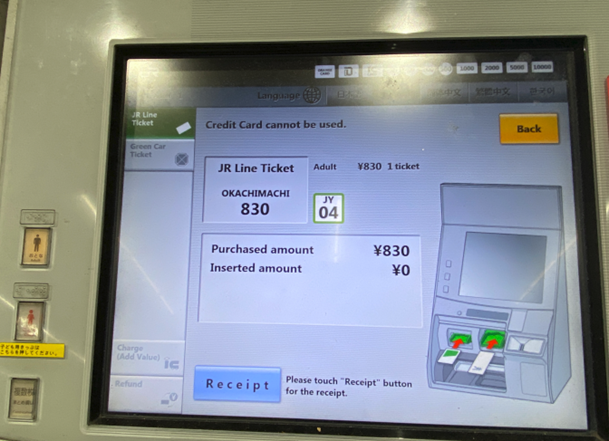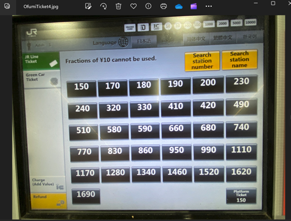 หน้าจอจากเครื่องซื้อตั๋วเดินทางจาก Ofumi station ถึง Okachimachi