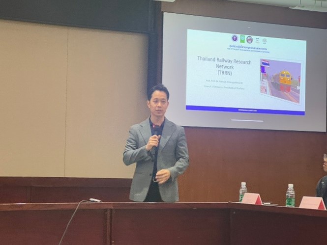 เมื่อเดินทางมาถึงมหาวิทยาลัย ทีมศูนย์รวมผู้เชี่ยวชาญระบบรางได้รับการต้อนรับอย่างอบอุ่นจากคณาจารย์และนักศึกษาบัณฑิตศึกษาของ SWJTU นำโดย Professor Huang Deqing และ Professor Zhou Fulin จากสาขาวิชาวิศวกรรมไฟฟ้า เริ่มต้นจากการนำเสนอประวัติและการพัฒนามหาวิทยาลัย Southwest Jiaotong University โดย Professor Huang Deqing จากนั้น ผู้ช่วยศาสตราจารย์ ดร.พรศักดิ์ ศรีสังสิทธิสันติ ได้เป็นตัวแทนนำเสนอกิจกรรมและภาพรวมของศูนย์รวมผู้เชี่ยวชาญระบบราง และ ดร.ทยากร จันทรางศุ เป็นตัวแทนกรมการขนส่งทางราง (Department of Rail Transport: DRT) นำเสนอการพัฒนาอุตสาหกรรมระบบรางในปัจจุบันและอนาคตของประเทศไทย นอกจากนี้ Professor Huang Deqing ยังได้นำเสนอทิศทางของงานวิจัยด้านวิศวกรรมไฟฟ้าในระบบการขนส่งทางราง โดยแบ่งออกเป็น 6 ทิศทาง ได้แก่