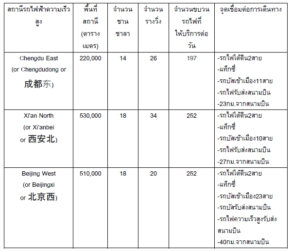 เครือข่ายรถไฟความเร็วสูงในสาธารณรัฐประชาชนจีนถือเป็นเครือข่ายที่ยาวที่สุดและมีการใช้งานแพร่หลายที่สุดในโลก โดยมีความยาวรวม 46,000 กิโลเมตร และรองรับการเดินทางของผู้โดยสารมากกว่า 2,000 ล้านครั้งต่อปี ในการเดินทางครั้งนี้ คณะของเราเดินทางโดยรถไฟฟ้าความเร็วสูง จากเมืองเฉิงตู (Chengdu) ไปยังเมืองซีอาน (Xi'an) และจากเมืองซีอานไปยังเมืองปักกิ่ง (Beijing) ซึ่งทำให้เราได้มีโอกาสใช้บริการรถไฟฟ้าความเร็วสูง 2 ขบวน และเยี่ยมชมสถานีรถไฟฟ้าความเร็วสูง 3 แห่ง แต่ละสถานีมีขนาดใหญ่มาก หากเปรียบเทียบกับสถานีกลางกรุงเทพอภิวัฒน์ที่มีพื้นที่รวมประมาณ 274,192 ตารางเมตร จะช่วยให้มองเห็นภาพได้ชัดเจนยิ่งขึ้น