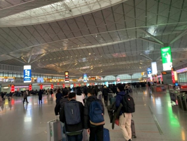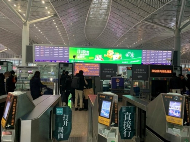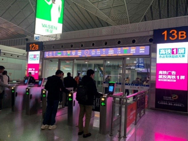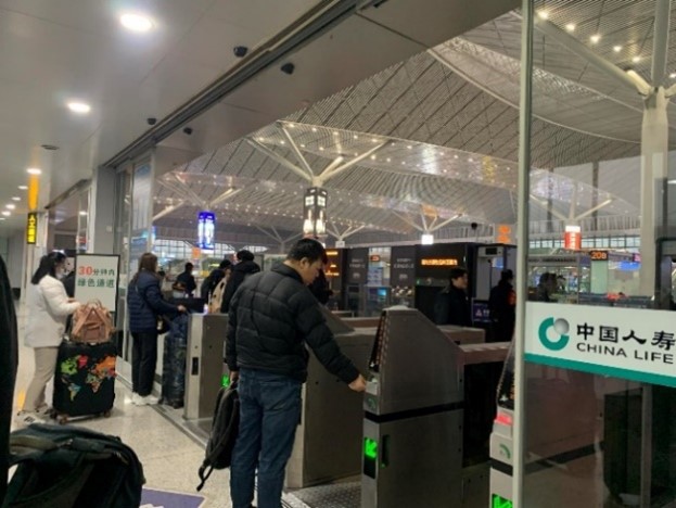เพื่อยืนยันความถูกต้องของข้อมูลตั๋วโดยสาร แล้วจึงผ่านลงไปยังชั้นล่างเพื่อขึ้นรถไฟขบวนที่ต้องการ โดยในตั๋วจะระบุเลขตู้และที่นั่ง สำหรับสัมภาระสามารถวางไว้ที่ชั้นเหนือที่นั่งหรือวางไว้ที่บริเวณท้ายตู้โดยสาร แม้ว่าปริมาณผู้โดยสารรถไฟความเร็วสูงในแต่ละขบวนจะมีจำนวนมาก แต่ผู้โดยสารทั้งหมดสามารถเข้าประจำที่นั่งได้อย่างเรียบร้อยภายในเวลาไม่กี่นาที รถไฟขบวนที่นั่งรองรับผู้โดยสารได้ 1,000 คน และทำความเร็วได้ 350 กิโลเมตรต่อชั่วโมง การขับเคลื่อนเป็นไปอย่างมีประสิทธิภาพ แทบจะไม่รู้สึกถึงความสั่นสะเทือน ความนิ่งอยู่ในระดับที่ผู้โดยสารสามารถวางแก้วที่มีน้ำร้อนเต็มไว้แล้วลุกไปโดยไม่ต้องกังวลว่าน้ำจะหก สะท้อนให้เห็นถึงความก้าวหน้าของเทคโนโลยีและมาตรฐานการพัฒนาระบบขนส่งมวลชนของสาธารณรัฐประชาชนจีน
