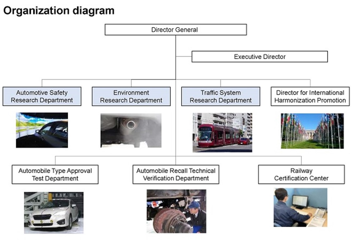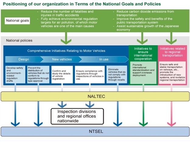 เดิม NTSEL ที่จัดตั้งในปี 1950 ภายใต้กระทรวงคมนาคมของประเทศญี่ปุ่น เป็นห้องปฏิบัติการและศูนย์ทดสอบ ที่สนับสนุนการกำหนดนโยบายของรัฐบาล ( Government policymaking) และการสร้างมาตราฐาน (Standardization) สำหรับยานยนต์ (Motor vehicles) และยานพาหนะอื่นๆ สำหรับการคมนาคมทางบก (Land transportation) แต่ในปี 2016 ได้ควบรวมกับ National Agency of Vehicle Inspection (NAVI) และได้กลายเป็น NTSEL ในปัจจุบัน ซึ่ง NTSEL เป็นศูนย์ทดสอบฯ หลักในการพัฒนาองค์ความรู้เพื่อกำหนดนโยบายและมาตราฐานต่างๆด้านการขนส่งทางบกของประเทศญี่ปุ่น ที่เกี่ยวข้องกับยานยนต์ ที่ครอบคลุมตั้งแต่การออกแบบไปจนถึงการใช้งานจริง โดยเป้าหมายและนโยบายของ NTSEL ดังแสดงในรูปที่ 2