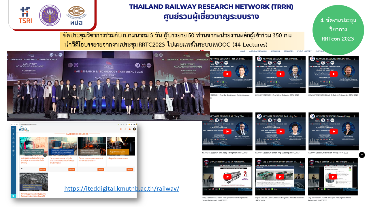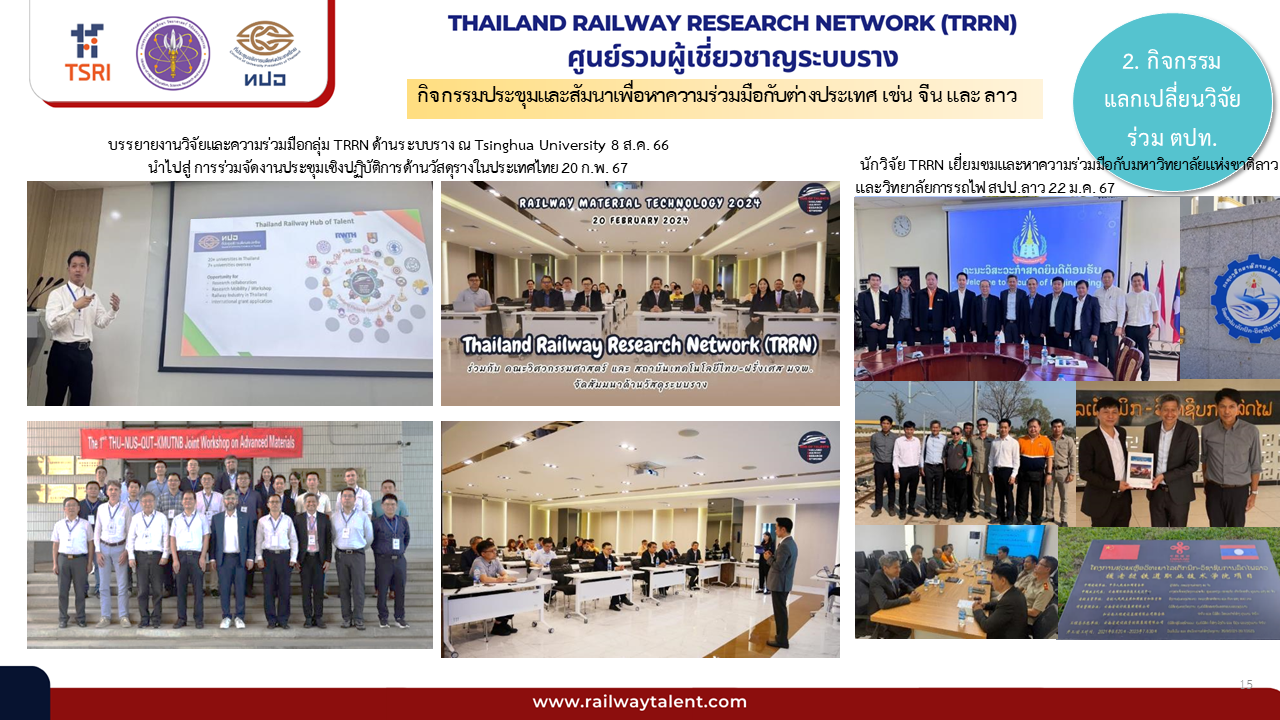 ส่งตัวแทนเข้าประชุมร่วมกิจกรรม workshop ร่วมกับเครือข่ายนักวิจัยระบบรางในต่างประเทศ เช่น ในประเทศอังกฤษ (กลุ่ม UKRRIN) ในประเทศจีน และ ส่งตัวแทนเข้าร่วมประชุมในสมาคมระบบรางในระดับโลก เช่น UIC
