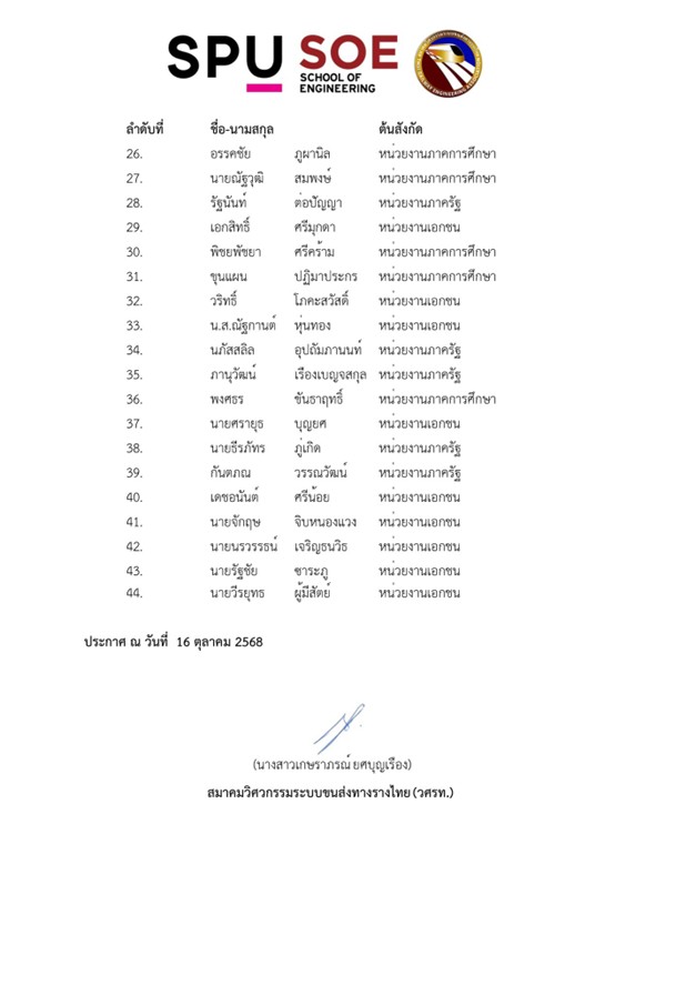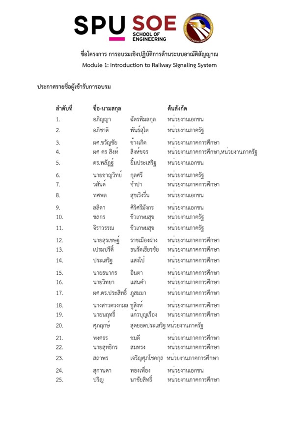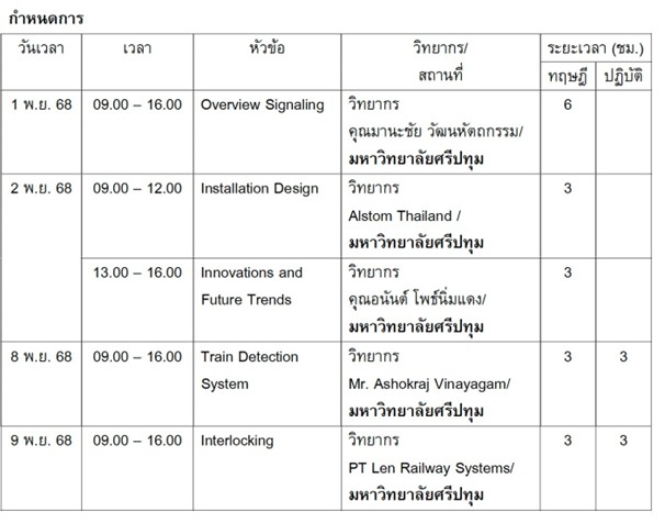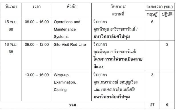 วัน-เวลาและสถานที่ในการอบรม: 1, 2, 8, 9, 15 และ 16 พฤศจิกายน 2568 ณ มหาวิทยาลัย ศรีปทุม และโครงการรถไฟชานเมืองสายสีแดง บริษัท รถไฟฟ้า ร.ฟ.ท. จํากัด