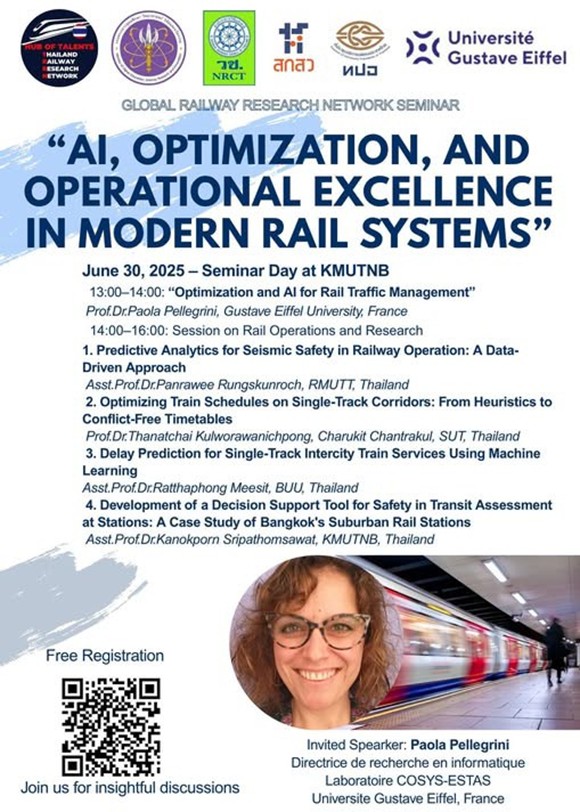 โดยมีการบรรยายเรื่อง "Optimization and AI for Rail Traffic Management" โดย Prof.Dr.Paola Pellegrini, Research Director of COSYS-ESTAS, Univertsité Gustave Eiffel, France การบรรยายงานวิจัยด้าน rail operations ของกลุ่มวิจัยจากมหาวิทยาลัยในเครือข่าย